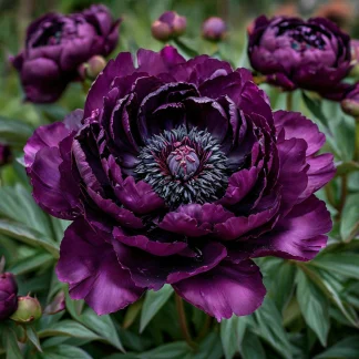 Представляем вашему вниманию эксклюзивный сорт пиона, способный превратить ваш сад в настоящий оазис загадочности и красоты — «Мечтательный Мираж». Этот сорт поражает воображение своим глубоким, насыщенным фиолетовым цветом лепестков и завораживающей чёрной сердцевиной, создающей эффект таинственного мерцания.